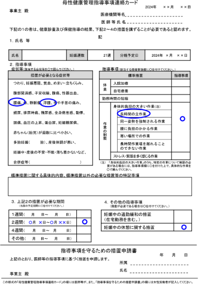 医師等の具体的な指導がない場合や措置が不明確な場合でも、社員が妊婦検診時等に職場での仕事内容を医師等に共有し、医師等が発行した母健連絡カードの提出を会社に求めることで、必要な措置を講じることができます。