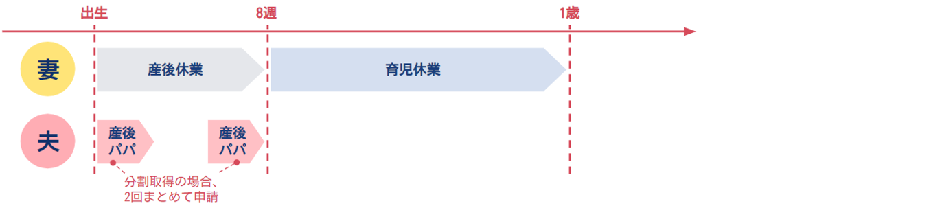 3.1回目は妻の出産・退院時+2回目は少し期間をあけて休業を分割取得(1週間~8週間以内)