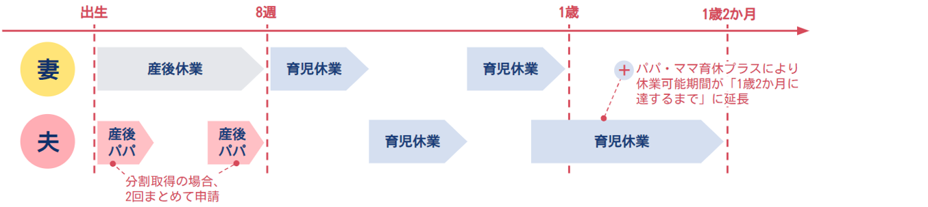 ※パパ・ママ育休プラスとは、両親がともに育児休業を取得する場合、原則子どもが1歳までの休業可能期間が「1歳2か月に達するまで」に延長される制度です。パパ・ママ育休プラスを利用するパパ(またはママ)の休業開始予定日が、子どもの1歳の誕生日以前であることやママ(またはパパ)が取得している育児休業の初日以降に取得していることなどの要件があります。